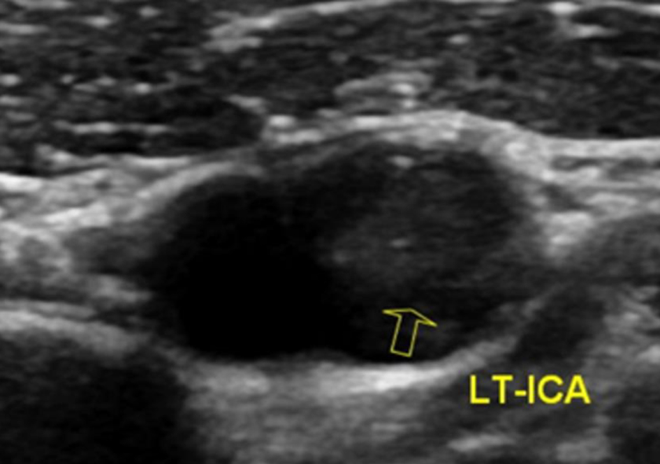 ![]() Click for large image | Figure 2. On carotid artery ultrasonography, there was a mobile lesion at the origin of the left internal carotid artery (yellow arrow). |