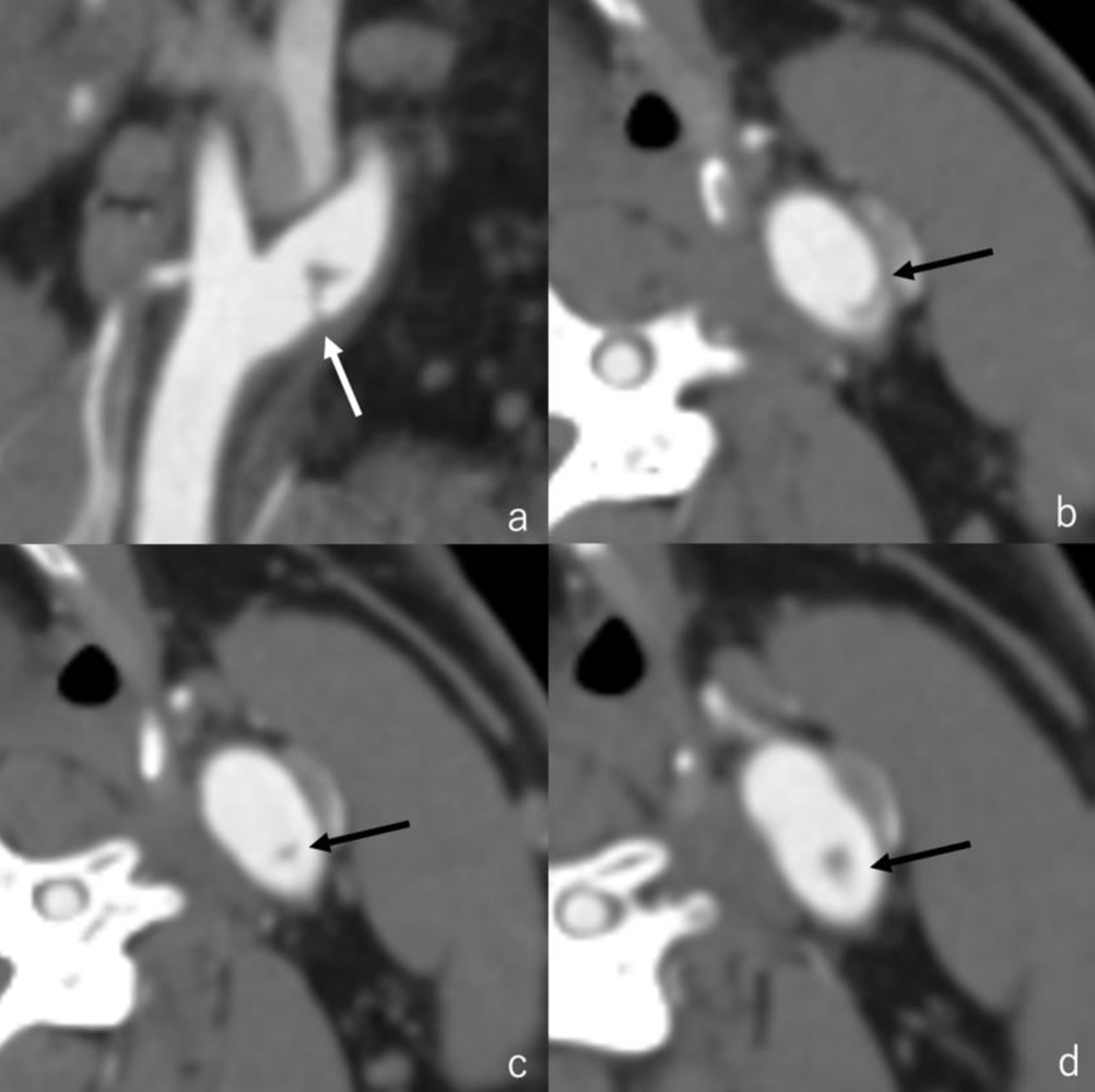 ![]() Click for large image | Figure 3. Three-dimensional computed tomography angiography revealed the presence of irregular contrast in the posterolateral wall of the left cervical internal carotid artery origin. (a) Sagittal image (white arrow); (b-d) axial images (black arrow). |