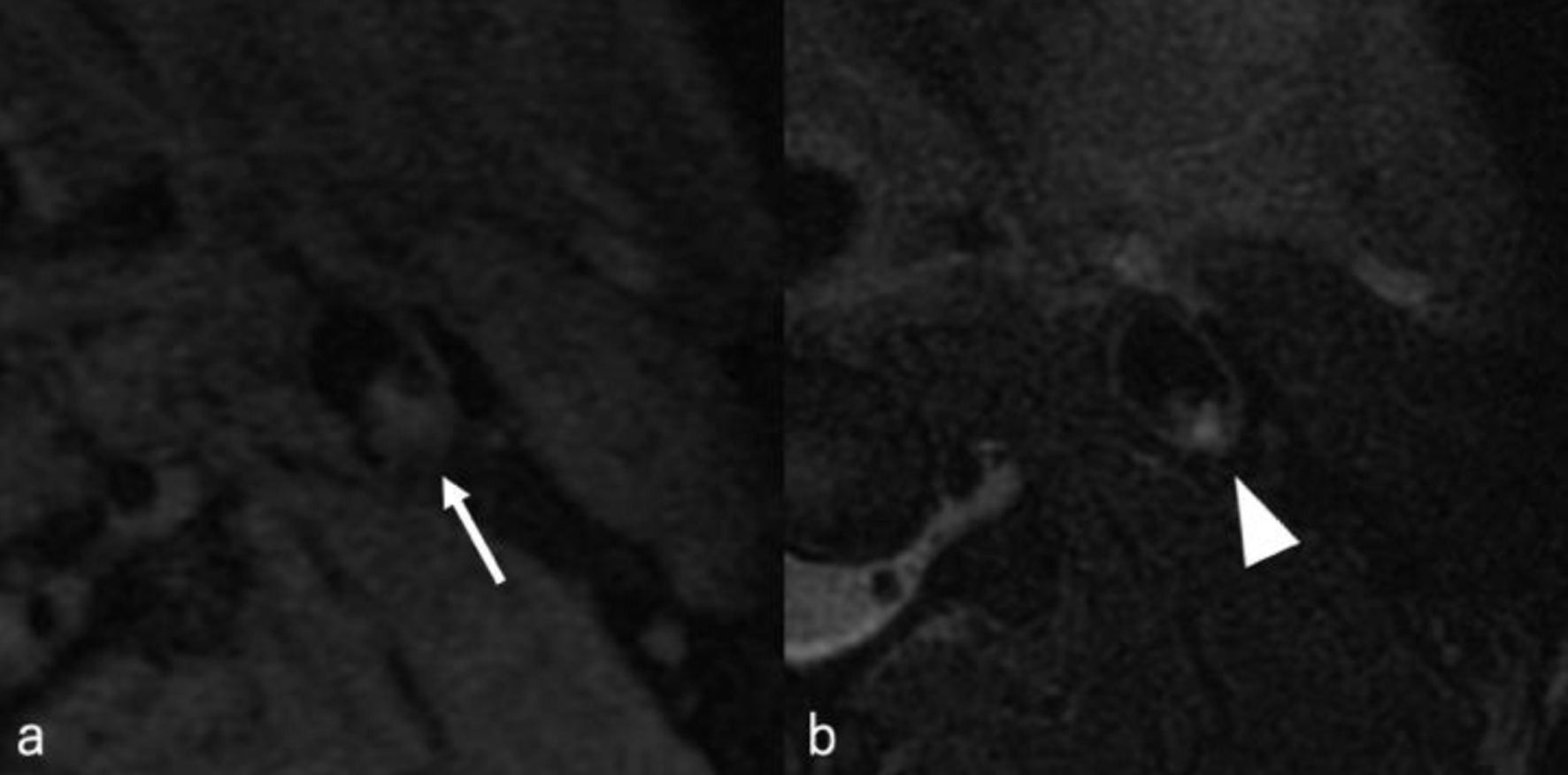 ![]() Click for large image | Figure 4. MRI plaque image revealed a structure that was T1 isointense (white arrow) (a) and T2 hyperintense (white arrowhead) (b) with the vessel wall, protruding into the lumen. MRI: magnetic resonance imaging. |