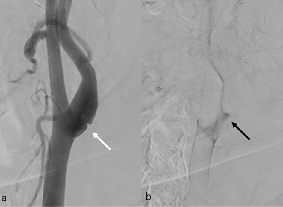 ![]() Click for large image | Figure 5. (a) Cerebral angiography revealed a shelf-like structure on the posterior wall of the left internal carotid artery origin on the second day. (b) Cerebral angiography revealed pooling of blood flow on the rostral side of the lesion. |