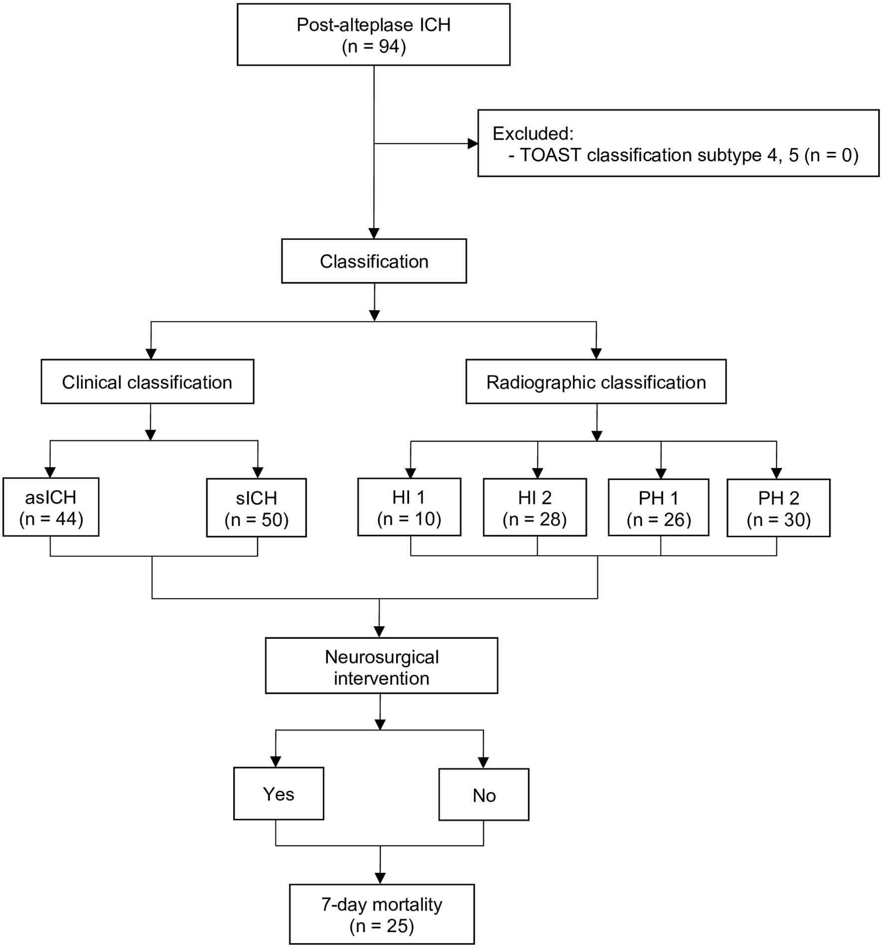 From January 2017 to December 2024, 94 patients developed post-alteplase ICH, with no exclusions. Classification was performed in two ways: 1) clinical, based on the ECASS II definition [1, 14], yielding 44 asICH and 50 sICH cases; and 2) radiographic, comprising 10 HI1, 28 HI2, 26 PH1, and 30 PH2 cases. Following consideration of neurosurgical intervention, 7-day mortality was assessed, with 25 deaths and 69 survivors (Fig. 2).