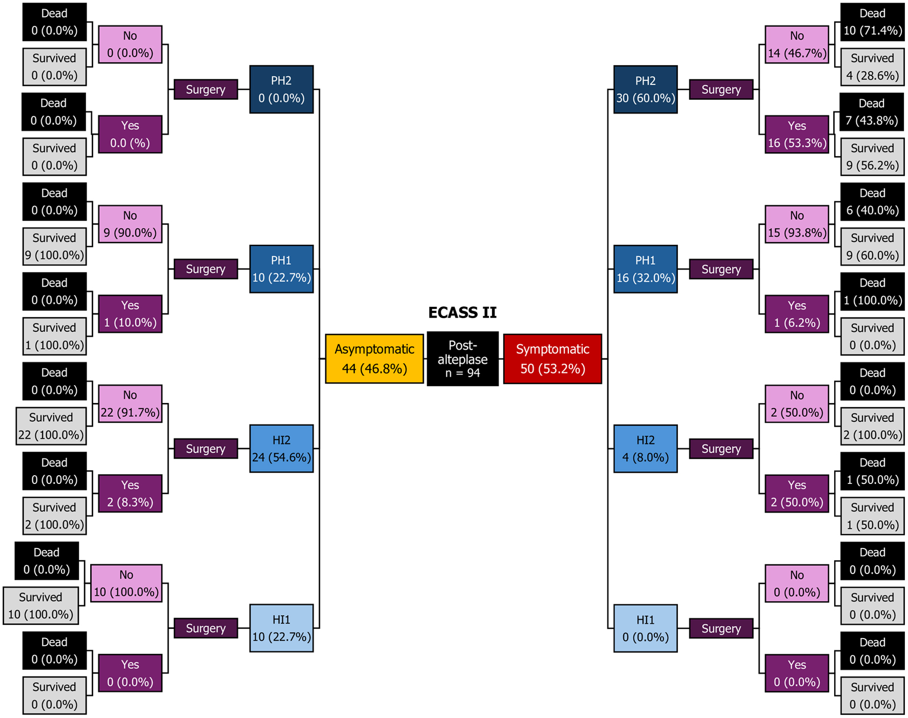 ![]() Click for large image | Figure 3. Decision tree diagram. ECASS II: European Cooperative Acute Stroke Study II; HI: hemorrhagic infarction; PH: parenchymal hematoma; Sx: surgery. |