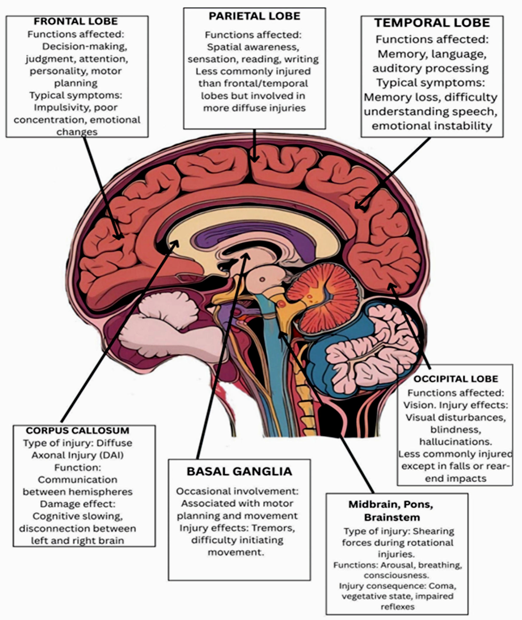 Figure 2 illustrates the major brain regions and their functions that are commonly affected by traumatic brain injury.