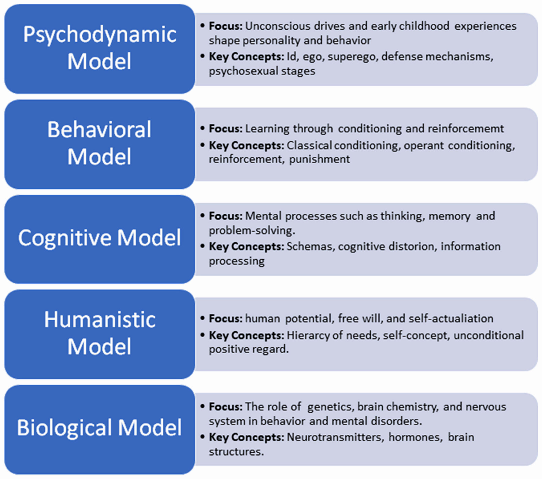 ![]() Click for large image | Figure 3. Overview of major psychological models, highlighting their focus areas and key concepts in understanding human behavior and mental processes [39]. |